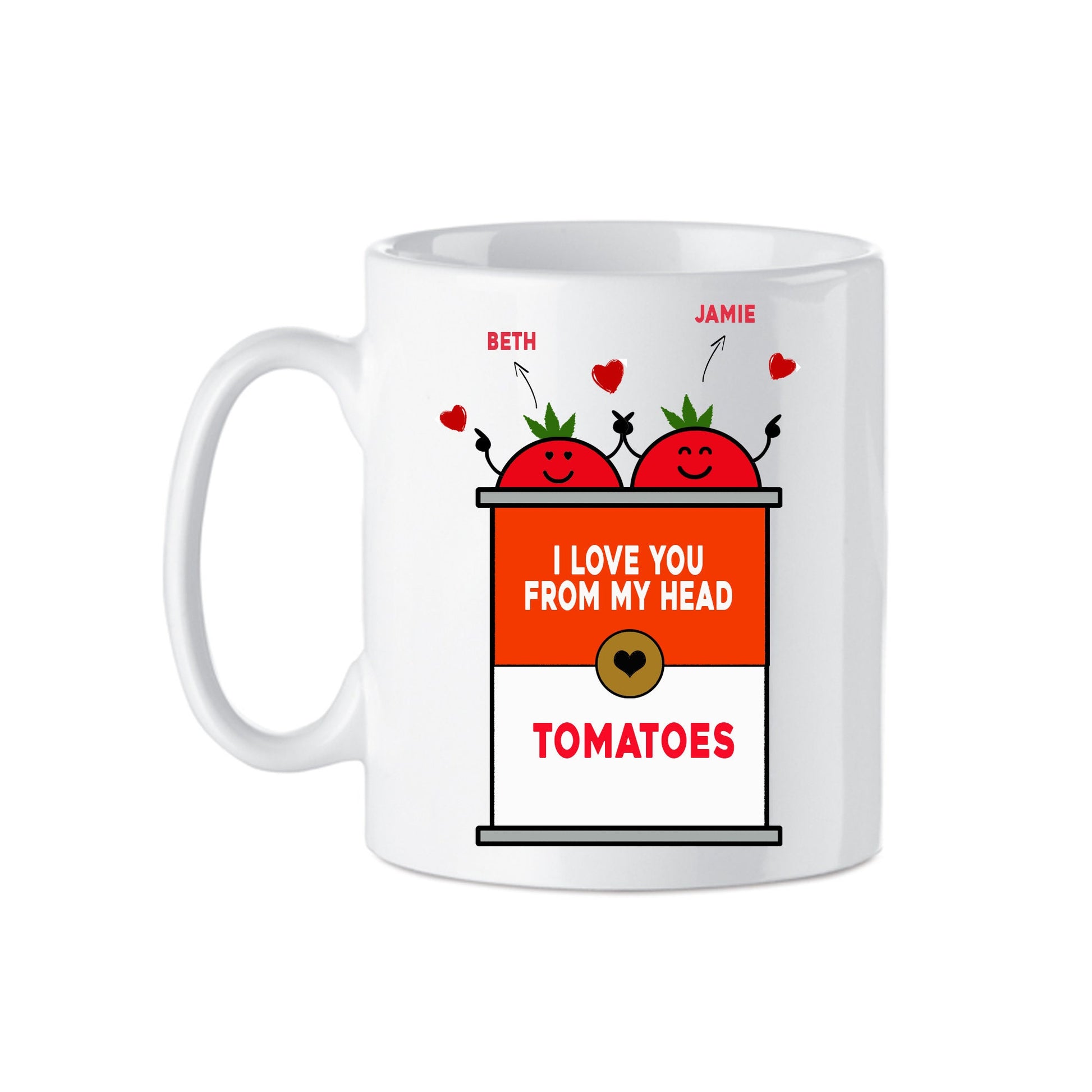 This novelty play on words white ceramic mug makes a cute gift for that special someone; telling them "I love you from my head...to-ma-toes!!". Made that extra bit more special with the ability to add names of choice to the tomatoes!