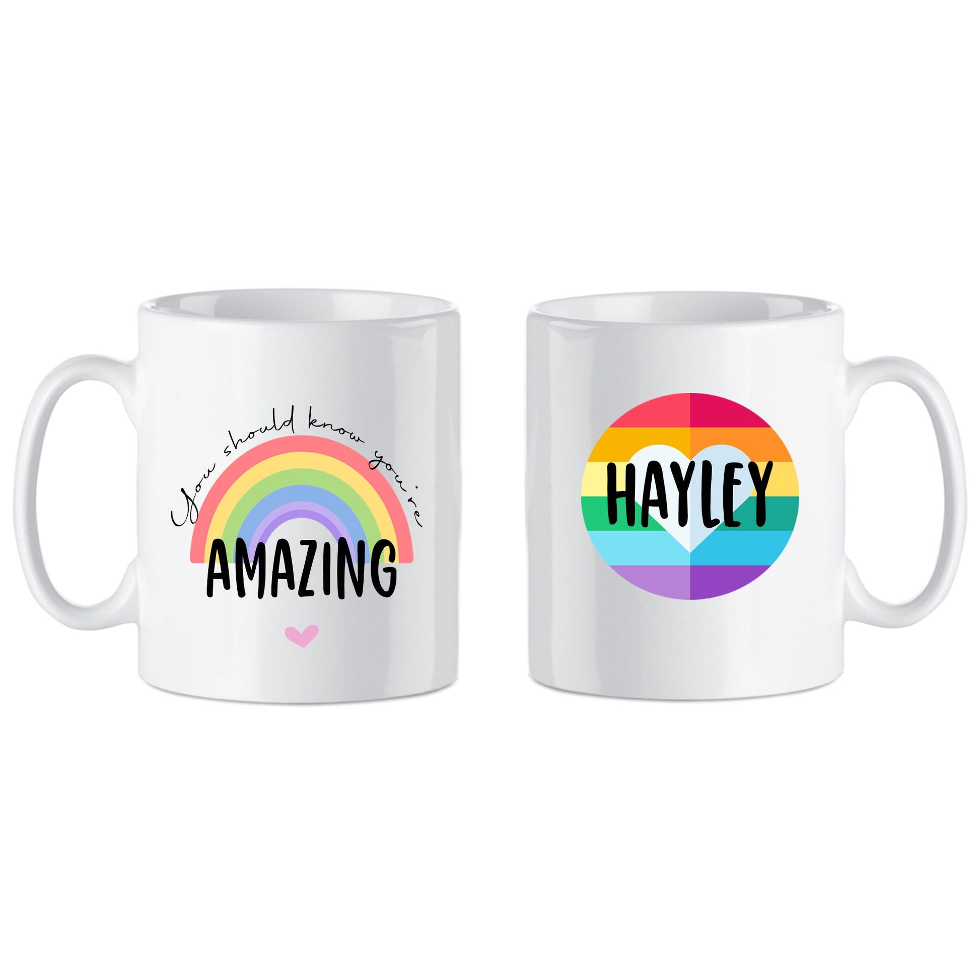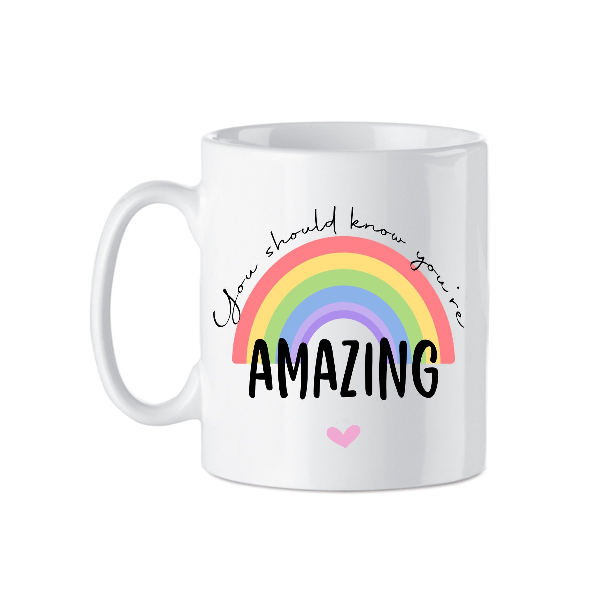 Brighten someone's day with this 11oz ceramic mug personalized with the cheerful "You're Amazing" rainbow design. Professionally printed to last, your message of encouragement will help make the perfect start to anyone's day.